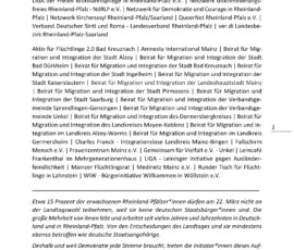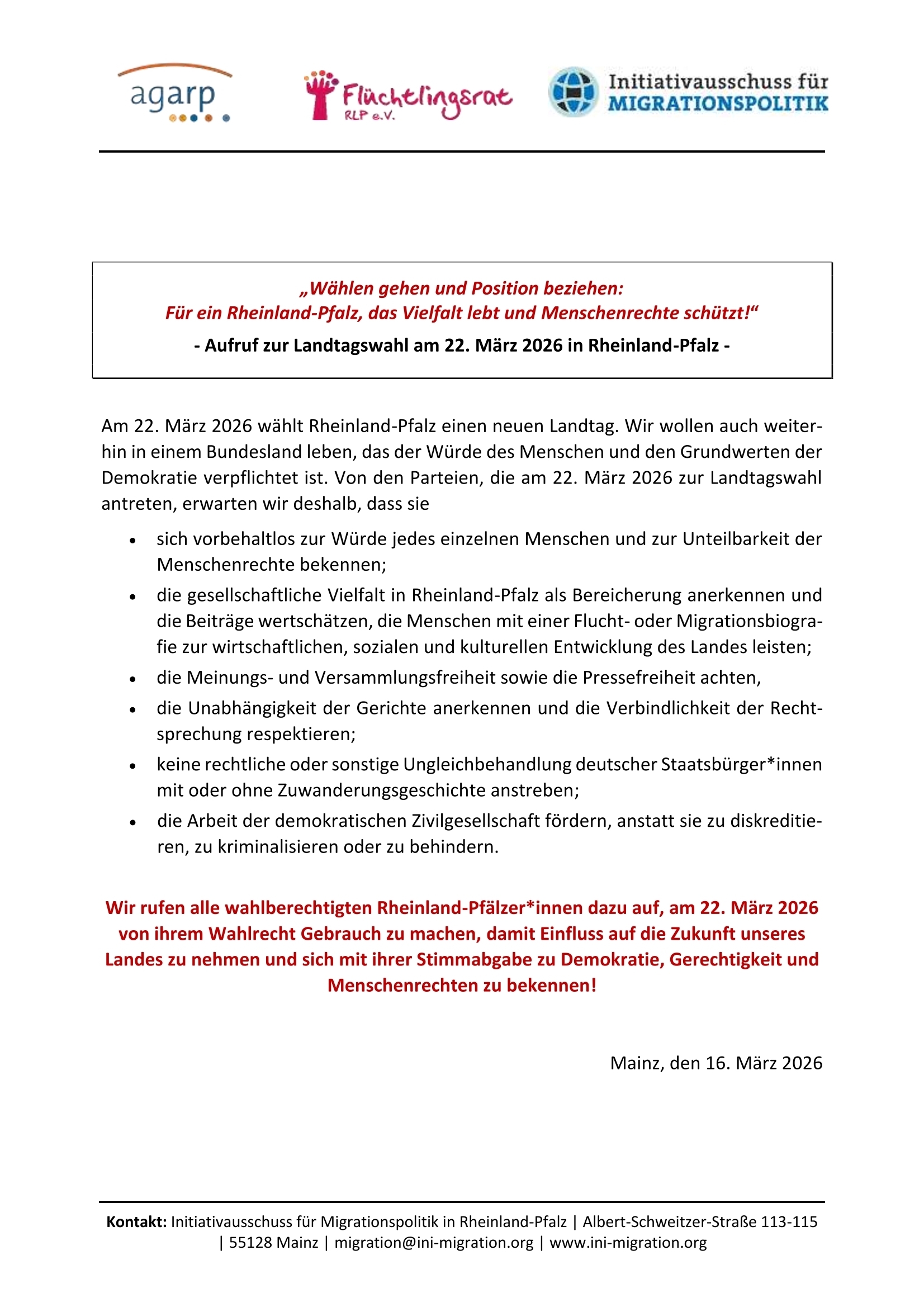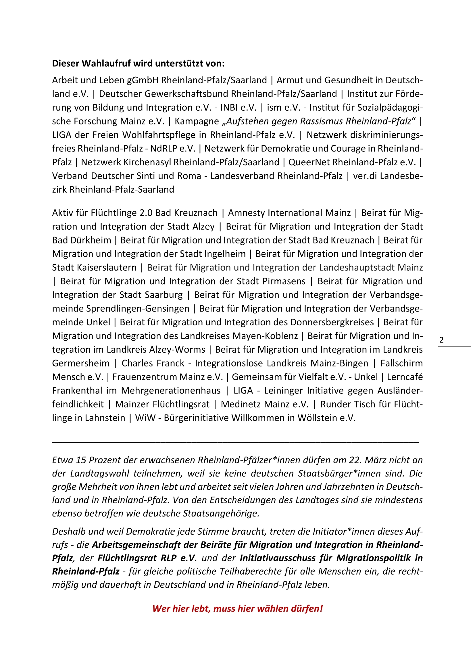 Neben der Arbeitsgemeinschaft der Beiräte für Migration und Integration in Rheinland-Pfalz (AGARP), dem Flüchtlingsrat RLP e.V. und dem Initiativausschuss für Migrationspolitik in Rheinland-Pfalz wird dieser Wahlaufruf zudem vom Deutschen Gewerkschaftsbund Rheinland-Pfalz/Saarland und der LIGA der Freien Wohlfahrtspflege in Rheinland-Pfalz e.V. getragen.
